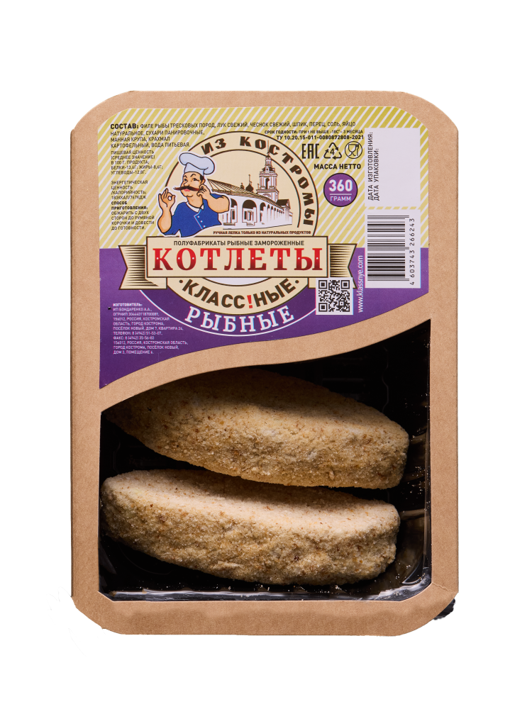 Филе рыбы тресковых пород, лук свежий, чеснок свежий, шпик, перец, соль, яйцо натуральное, сухари панировочные, манная крупа, крахмал, вода питьевая